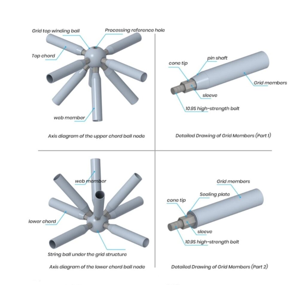– OverviewA space frame structure is a three-dimensional structural system made of steel tubes connected by spherical nodes. It is widely used in large-span roofs such as stadiums, airports, exhibition halls, and industrial buildings.Main Components1. Ball Node (Spherical Joint)The central steel sphere that connects multiple members in different directions. It distributes loads evenly across the structure.2. Top ChordThe upper horizontal members of the space frame. They carry roof loads such as cladding, wind, and snow.3. Lower ChordThe lower horizontal members that provide structural stability and balance tension forces.4. Web MembersDiagonal members connecting the top and lower chords. They transfer loads between the layers and create the three-dimensional strength of the structure.Grid Member DetailsSteel PipeThe main structural element forming the frame.Cone TipA conical connector welded to the steel pipe to connect with the ball node.SleeveA connecting piece between the steel pipe and the bolt.High-Strength Bolt (Grade 10.9)A high-strength bolt used to secure the member to the ball node.Sealing PlateA plate used to close the end of the pipe and protect it from moisture and dust.Advantages of Space Frame StructuresLightweight but very strongCapable of covering large spans without columnsFast installationFlexible architectural shapes
